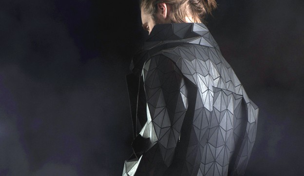 Concentrated, la colección de Sruli Recht que sorprendió el pasado invierno por la utilización en sus prendas de materiales como la madera de nogal. Láminas triangulares de madera que, adheridas a una base textil, dan como resultado un material flexible de aspecto geométrico.