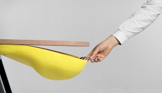 Diseñado para albergar pequeños tesoros de la vida cotidiana, Balka es una mesa para el recibidor que cuenta con una hendidura tallada por la que los objetos se deslizan hacia un gran volumen contenedor en la parte inferior de la tabla. Esta pieza oculta el desorden y permite recuperar los elementos gracias a un pequeño agarre lateral que abate el conjunto. Noticias de Trendhal.