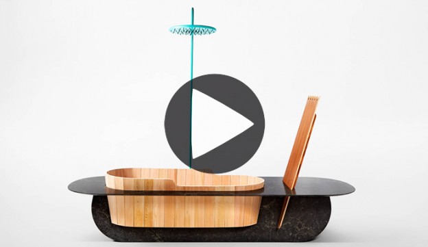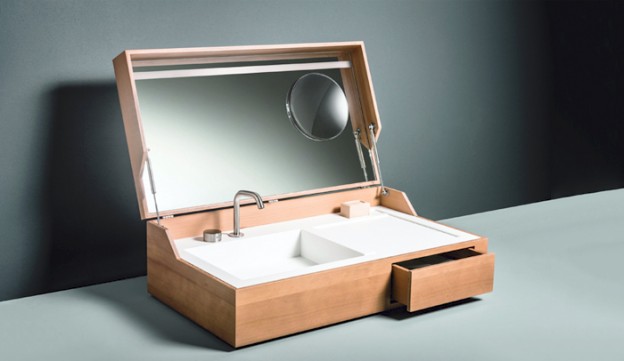 Un lavabo portátil oculto dentro de una caja de madera. Equipado con una pila de Corian®, grifería en acero inoxidable, espejo con una lente de aumento, estante, cajón portaobjetos, luz y enchufe. Su diseño de Giulio Gianturco, se inspira el mundo de la náutica donde abundan este tipo de objetos herméticos que esconden diversos artilugios en su interior.
