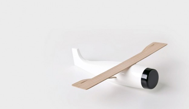 Una colección de juguetes de aire, tierra y agua, diseñada por Studio Vrtiška • Žák que incluye tres modelos: woo aeroplane, woo bulldozer y woo sailboat. Los vehículos están fabricados en madera maciza barnizada y chapa de madera curvada.