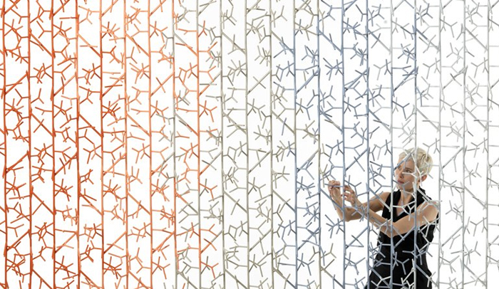 Amass es un sistema modular compuesto por tres piezas diferentes que se conectan de formas distintas. Un proyecto de Benjamin Hubert presentado durante la feria 100 % Design de Londres, donde 46.000 piezas se entrelazaron para formar un panel divisor que delimitaba diferentes auditorios y a través de los cuales los transeúntes podían mirar y escuchar. Noticias de Trendhal.