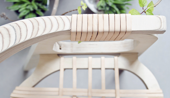 Esta silla diseñada por Jessy Van Durme (Klaer Studio), está formada por un marco de abedul ligero y un asiento tejido de piel. Los cuatro elementos que forman la silla, brazos, patas y asiento, se mantienen unidos por tiras de cuero entrelazadas con una técnica basada en el trenzado del ratán. Un proceso artesanal aplicado a un nuevo contexto material.