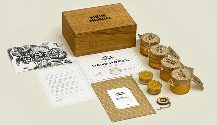 Mein Hoing es un proyecto de Identidad de Marca llevado a cabo por Thomas Lichtblau al frente de un equipo multi-disciplinar de seis miembros que conforman la plantilla de esta pequeña empresa productora de miel. Un aspecto importante en el diseño del packaging se ha centrado en distinguir los cuatro tipos de miel. Se han considerado los aspectos formales (geométricos) evitando el color. De hecho los aspectos cromáticos vienen a través de los tarros, jugando con las tonalidades de la miel y los tampones impresos con estampados.