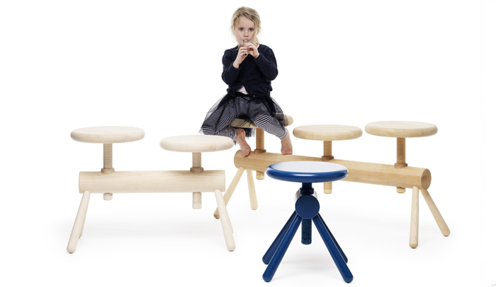 Inspirada en el tradicional taburete de piano, la colección de Mia Cullin incluye un taburete y un par de bancos con dos y tres asientos regulables en altura. Orkester se fabrica en madera de fresno al natural o esmaltado.