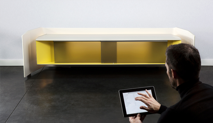 Wide es un nuevo concepto de aparador con un sistema de audio integrado que permite la optimización de todos los dispositivos multimedia. Vincent Tordjman ha colaborado con el ingeniero de electroacústica Dr. Yvon Maurel (La Boîte Concept) para el desarrollo de este innovador proyecto que integra doce altavoces internos. Noticias de Trendhal.